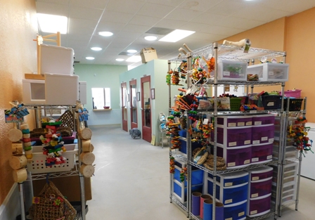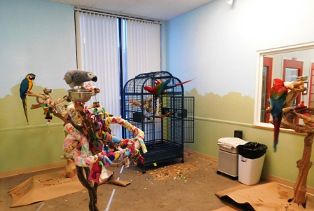 For our avian guests we provide out of cage time for most of the day in one of our two aviaries. Birds get to stretch their wings while enjoying their own play stand, vocal interaction with fellow bird guests, and deconstruction of their toys. They also enjoy a misting time and a snack before going to bed.