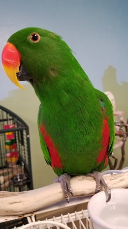 Birds are provided with pellets, seeds, nuts, fresh fruit and veggies, cooked grains, filtered water, 'out of cage time', toys, interaction and many other amenities.