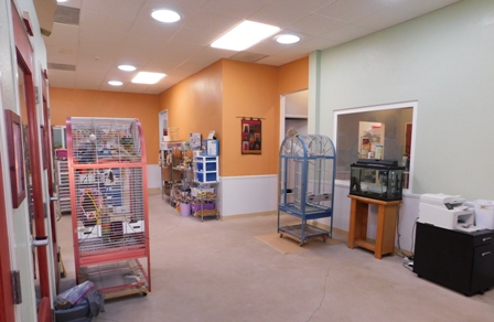 We have created something unique by combining cat and bird lodging into our retail showrooms. Each cat family stays in their own suite and enjoys the many amenities of climbing ramps, water fountain, etc. Each walk-in suite is a minimum of 4ft x 6 ft x 8 ft high with a window door to look out on to the aviary or to supervise the business. Each suite is large enough for 2 cats and staff to enter, sit down and have play time with kitty.