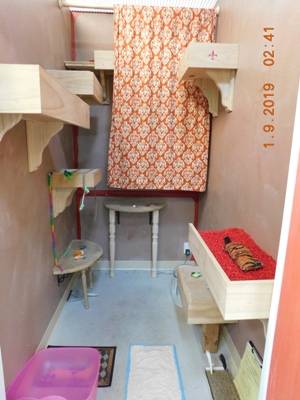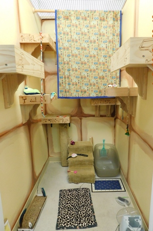 Our Rooms: Every cat family has their own standard size 4ft x 6 ft x 8ft high walk-in suite. We do not offer communal lodging or play areas to ensure private and clean accommodations. Our suites are designed so that we may go in, sit down and spend time with kitty. All suites are large enough for 2 cats with the exception of our larger suites, for cat families with more than two cats or cats that need extra space. All suites can be expanded, with a creative kitty walk through, for the larger cat families. Our suites are set up so kitty will not see the other cats that are staying with us, which helps alleviate stress.
