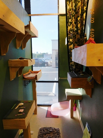 Shy kitty: We understand the shy kitty and they will have plenty of places to hide, high and low, for private peering down or out. We will still go in and at least spend time with kitty because that might help them relax a little more. They can also come out at their own pace and when they are ready to make friends we will be there. Sometimes a plug-in of Feliway, a cat pheromone, can help too.